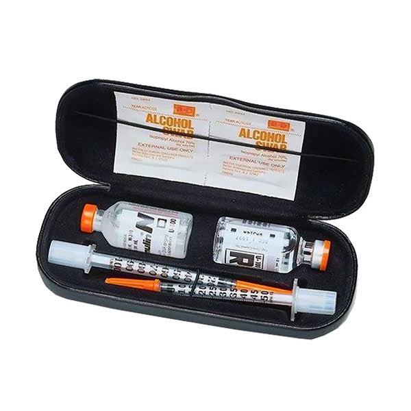 Simulating a designer eyeglass case, the DI Case Insulin Protector is made of lightweight aluminum with a fitted insert that holds two vials of insulin, two syringes, and alcohol swabs.